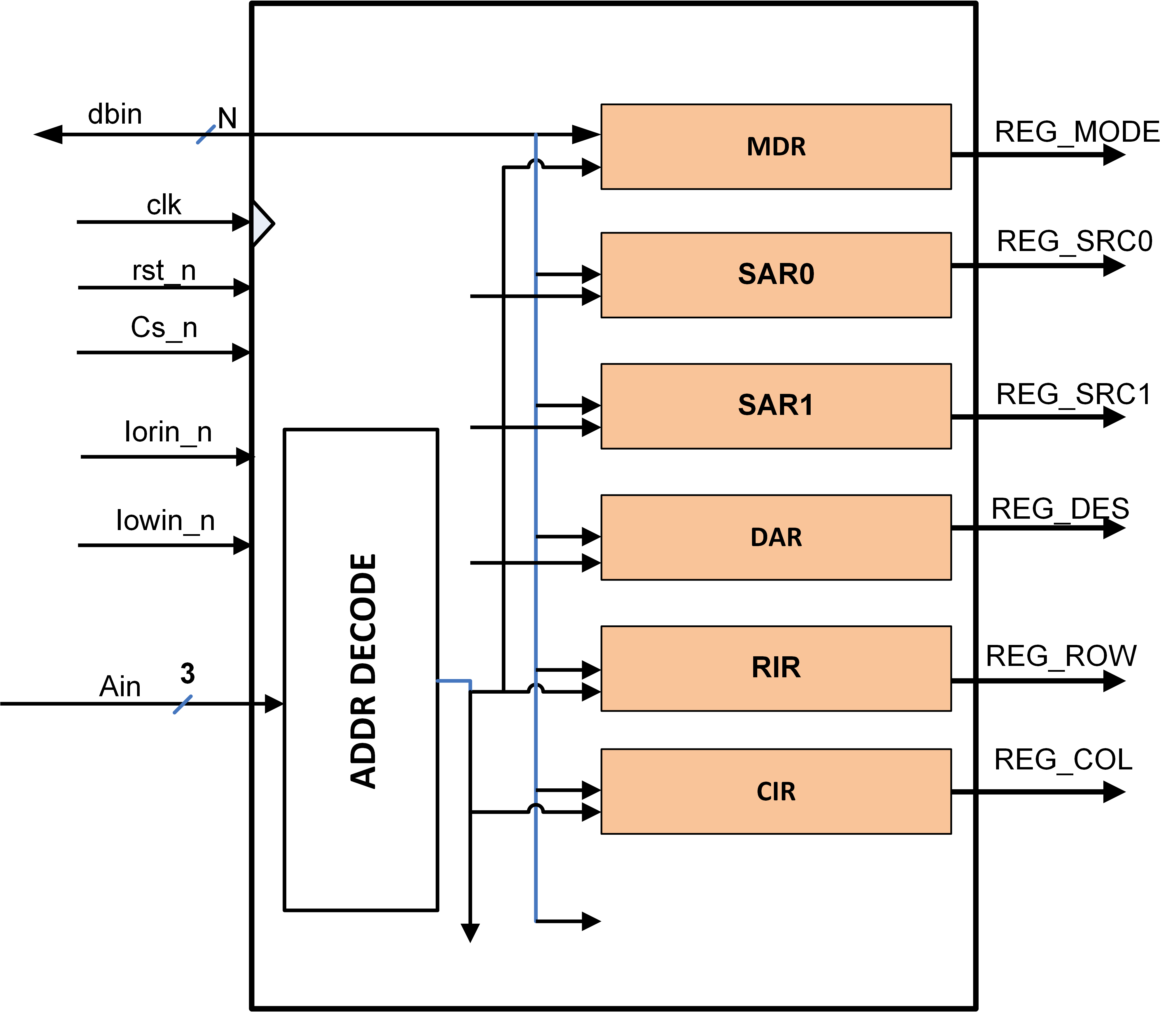 Bộ giải mã địa chỉ ADDR_DECODE trong tệp thanh ghi điều khiển nhận dữ liệu đầu vào từ bus Ain và lựa chọn một thanh ghi để viết dữ liệu như thể hiện trong Bảng 3.