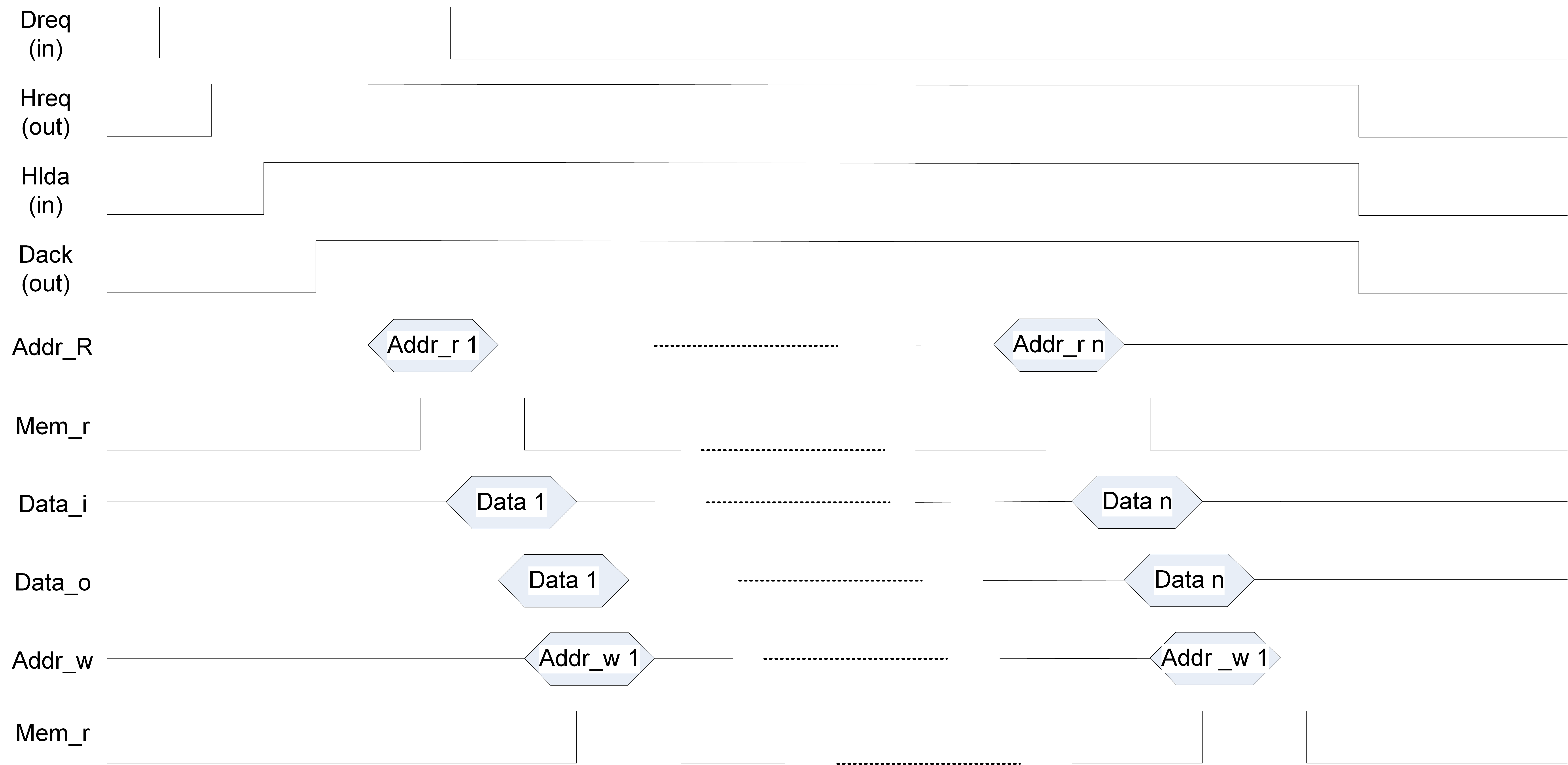 Giản đồ thời gian các tín hiệu thực hiện giao thức bắt tay giữa DMAC và CPU.