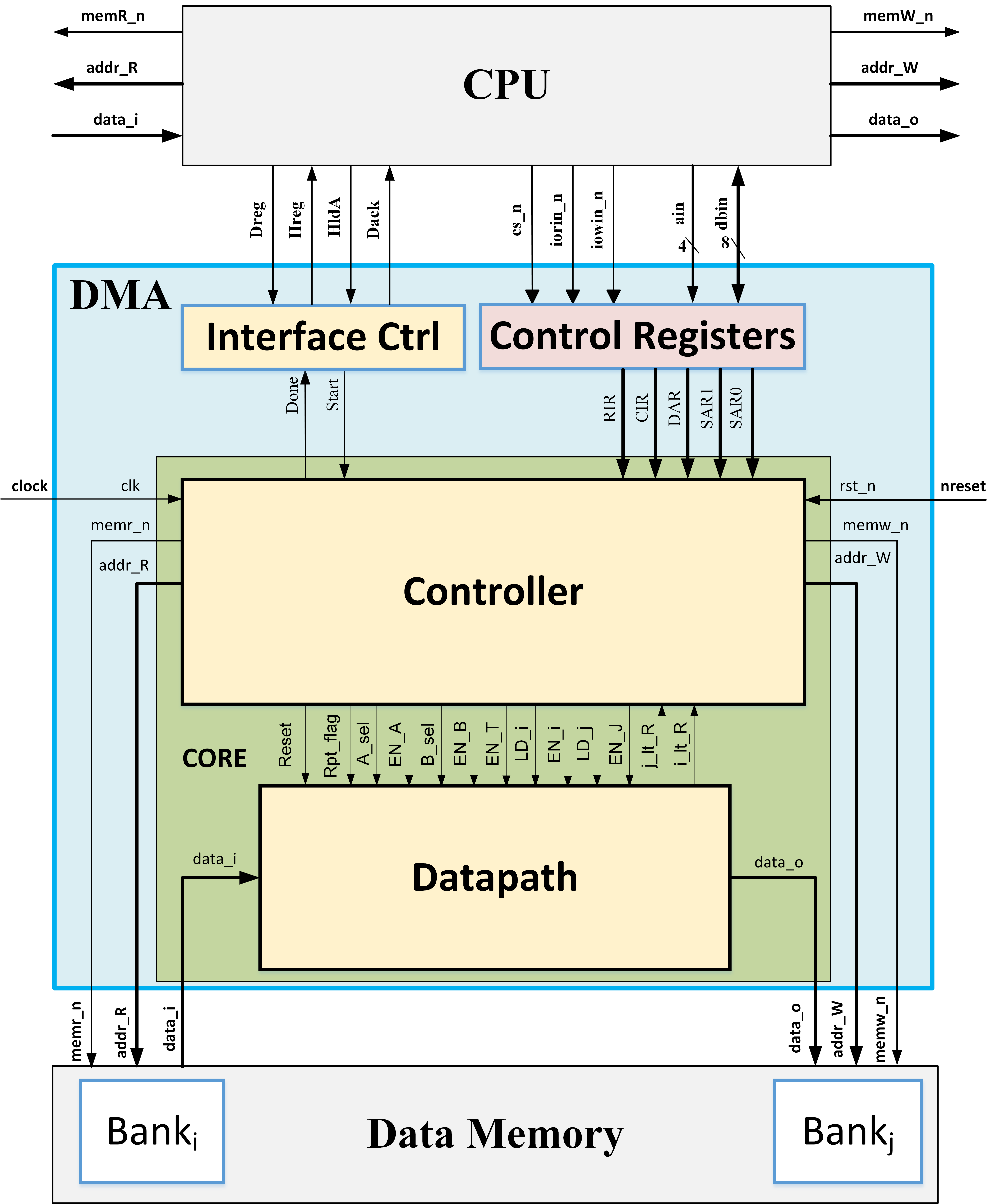 Mục tiệu: Thiết kế, mô phỏng và thực thi một đơn vị điều khiển truy xuất trực tiếp bộ nhớ (DMAC: Direct Memory Access Controller). Đơn vị thực hiện chức năng copy một khối dữ liệu a có gồm L phần tử từ địa chỉ A và ghi tới tới địa chỉ B trong không gian bộ nhớ của hệ thống. Các tham số L, A, B phải được nạp vào các thanh ghi điều khiển (RIR, SAR và DAR) của DMAC trước khi quá trình DMA diễn ra.