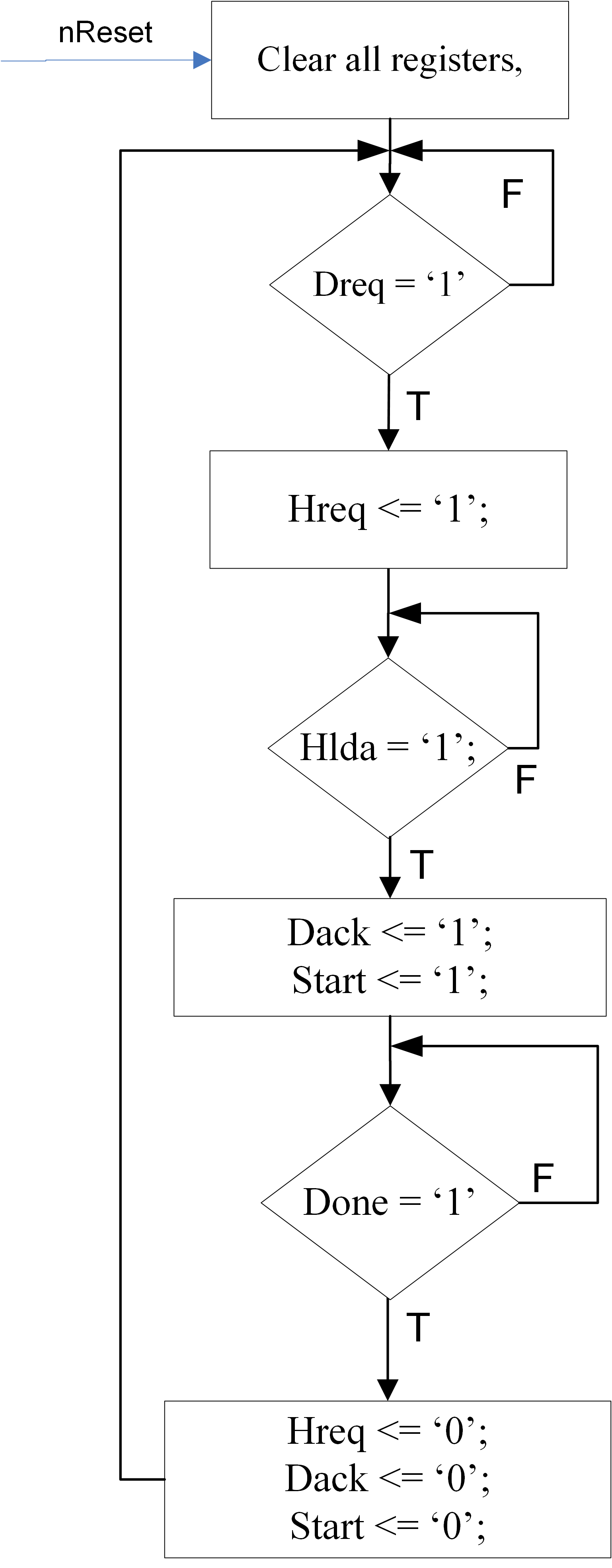 Hoạt động của bộ điều khiển giao diện ghép nối giữa DMAC và CPU được mô tả bằng giản đồ thời gian như chỉ ra trong Hình 4. Thuật toán điều khiển giao thức bắt tay giữa DMAC và CPU được mô tả bằng lưu đồ máy trạng thái FSMD trong Hình 7.
