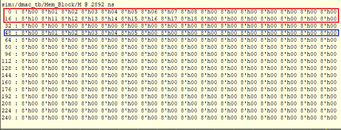 Hình 14: Nội dung của bộ nhớ lấy mẫu tại thời điểm 2892 ns, sau lần DMA thứ nhất và trước khi quá trình DMA lần thứ hai diễn ra.