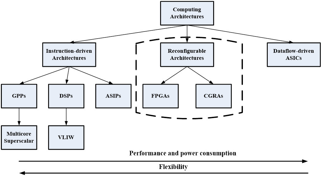 Về cơ bản, có hai phương pháp chủ yếu được sử dụng cho việc thực thi một chức năng mong muốn trong các hệ thống nhúng truyền thống (Hình 1). Một phương pháp là sử dụng mô hình tính toán được vận hành bởi luồng dữ liệu (dataflow-driven), chẳng hạn các vi mạch tích hợp chuyên dụng ASIC (Application Specific Integrated Circuit). Phương pháp thứ hai là sử dụng các bộ vi xử lý được vận hành bởi các lệnh (Instruction-driven) nạp sẵn trong bộ nhớ, chẳng hạn như các bộ vi lý nhúng của ARM, các bộ xử tín hiệu số DSP (Digital Signal Processor) hoặc các bộ xử lý có tập lệnh xác định cho một miền ứng dụng cụ thể ASIP (Application-Specific Instruction Set Processor). Tuy nhiên, cả hai phương pháp trên đều không thể thỏa mãn được tất cả các yêu cầu trong việc thực thi các ứng dụng đa phương tiện thế hệ tiếp theo [1]. Một vi mạch ASIC được thiết kế chuyên dụng cho một chức năng định trước vì thế nó được tối ưu để thực thi một cách hiệu quả nhất chức năng đó. Tuy nhiên, sau khi thiết kế đã được chế tạo thành vi mạch, chức năng của nó là không thể thay đổi. Nếu có bất kỳ yêu cầu nào về thay đổi chức năng, vi mạch cần phải được thiết kế và chế tạo lại. Quá trình này là khá tốn kém, đặc biệt nếu xem xét tới việc phải thay thế vi mạch đó trong một lượng lớn các hệ thống hoặc sản phẩm đã được triển khai ứng dụng. Ở thái cực kia, các bộ vi xử lý có độ mềm dẻo cao hơn bởi khả năng thực thi một chuỗi lệnh để hoàn thành một chức năng mong muốn. Bằng việc thay đổi chuỗi các lệnh chạy trên vi xử lý, chức năng của hệ thống sẽ được thay đổi mà không cần bất cứ sự hiệu chỉnh nào trong phần cứng. Tuy nhiên nhược điểm của các bộ vi xử lý là hiệu năng tính toán và hiệu quả sử dụng năng lượng thường thấp hơn nhiều so với mạch ASIC. Nguyên nhân là bởi bộ vi xử lý cần thực hiện một chuỗi các thao tác như nạp lệnh từ bộ nhớ, giải mã lệnh trước khi lệnh thực sự được thực thi. Hơn nữa việc thực hiện một cách tuần tự một chuỗi các lệnh để hoàn thành một chức năng mong muốn cũng làm tốc độ xử lý của vi xử lý thấp hơn rất nhiều các mạch ASIC. Để nâng cao hiệu năng tính toán, đồng thời giảm công suất tiêu thụ, đã có nhiều cải tiến đối với kiến trúc của các bộ xử lý được đề xuất như Superscale, VLIW (Very Long Instruction Words), SIMD (Single Instruction Multiple Data), MIMD (Multiple Instruction Multiple Data), … Bên cạnh đó, công nghệ chế tạo các bộ xử lý cũng không ngừng được cải tiến để nâng cao tần số hoạt động, tiếp đến tăng số lõi xử lý (từ đơn lõi tới hai lõi, và hiện nay là đa lõi) được tích hợp trên cùng một chip vi xử lý. Tuy nhiên về cơ bản các giải pháp này vẫn dựa trên phương thức xử lý được vận hành bởi dòng lệnh, do đó về cơ bản không thể giải quyết được tận gốc vấn đề mà phương thức xử lý vận hành bởi dòng lệnh đang phải đối diện như được nêu ở trên.
