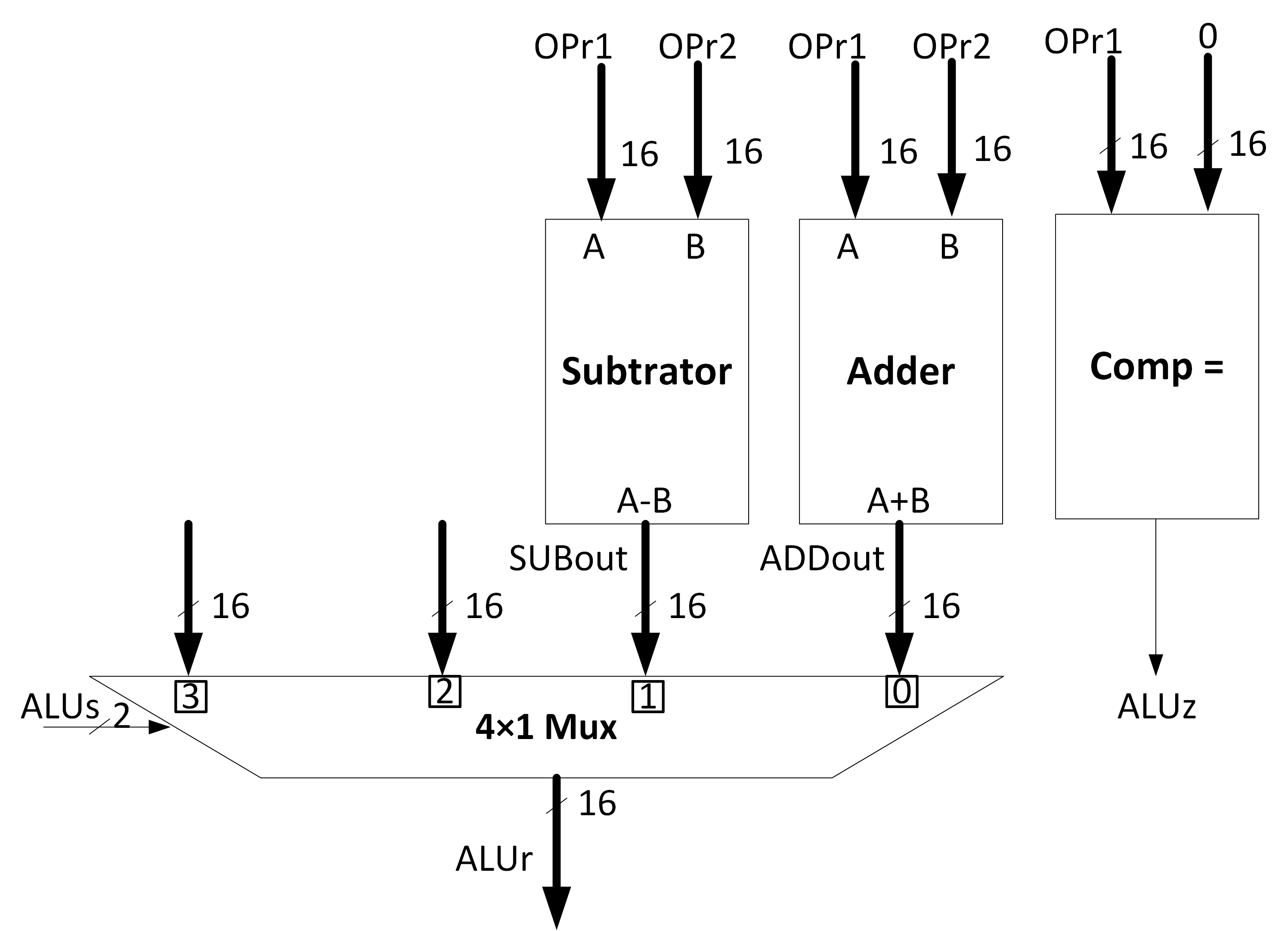 - ALU (arithmetic and logic unit): hỗ trợ các phép tính logic và số học trên dữ liệu 16-bit như chỉ ra trong tập lệnh Bảng 1