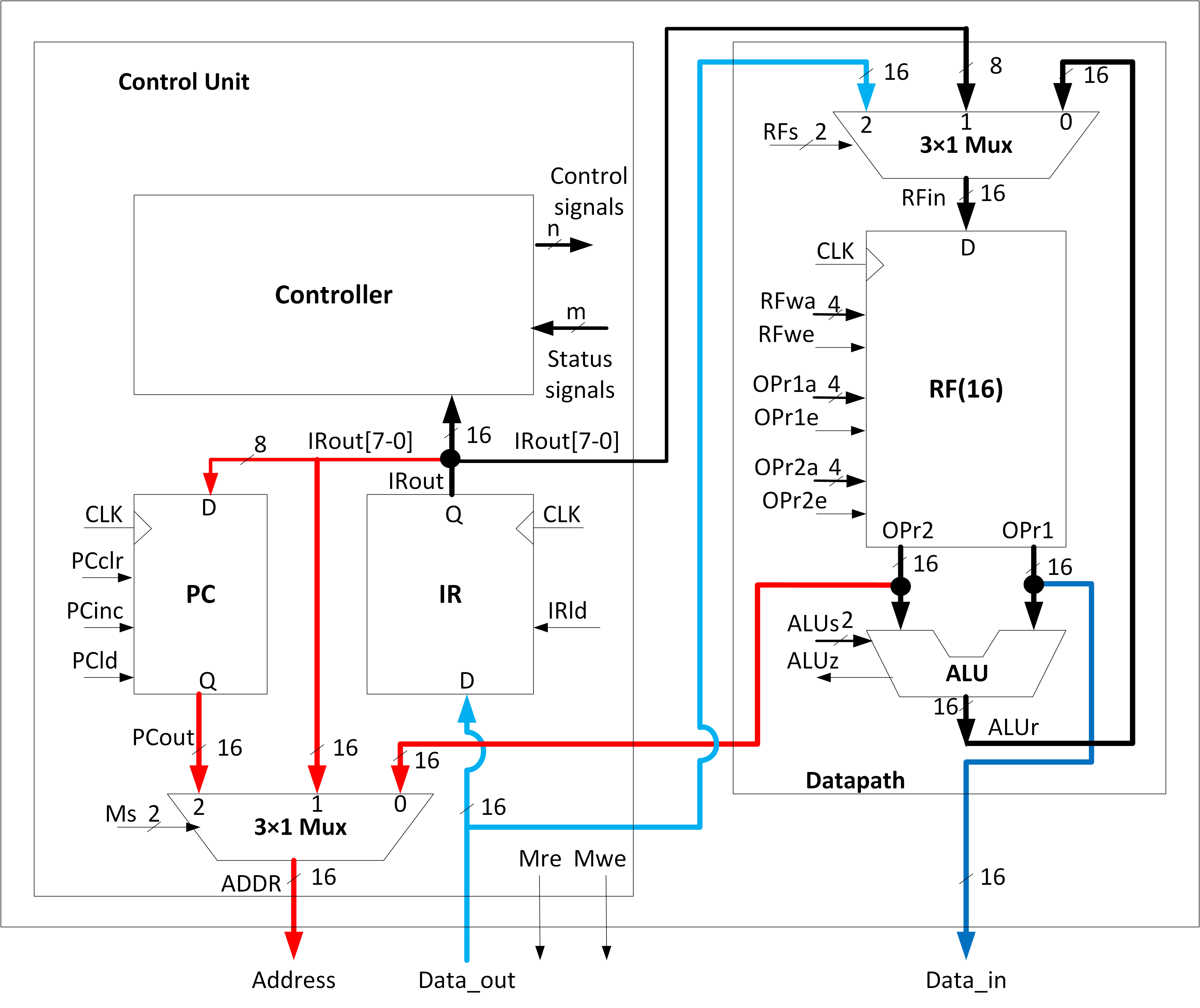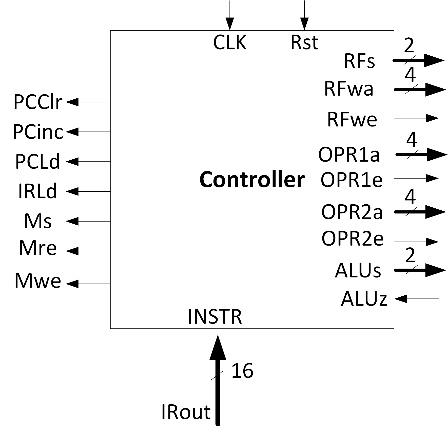 - Controller: điều khiển quá trình đọc lệnh từ bộ nhớ vào thanh ghi IR sau đó tiến hành giải mã lệnh và tạo ra các tín hiệu điều khiển hoạt động của datapath nhằm thực hiện lệnh được nạp trong IR.