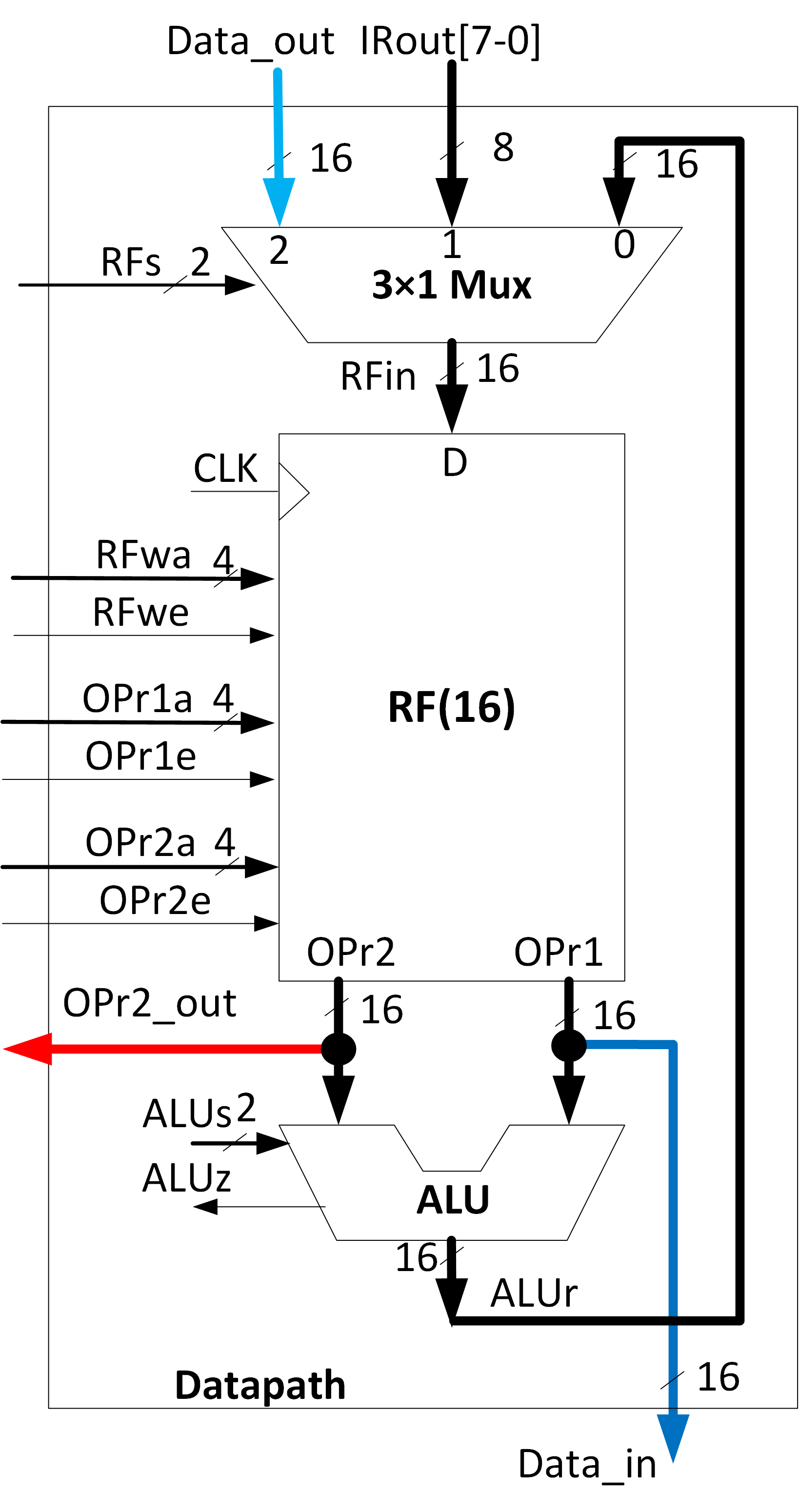 Trong bộ vi xử lý, đơn vị xử lý dữ liệu Datapath thực hiện tất cả phép tính được yêu cầu bởi bộ vi xử lý. Datapath thường được cấu thành bởi các mạch để thực hiện các toán tử số học (cộng, trừ, nhân, so sánh …) và các phép tính logic (and, or, ..), các bộ hợp kênh và phân kênh để điều hướng luồng dữ liệu, các phần tử nhớ (thường là các thanh ghi) để lưu dữ liệu và kết quả trung gian trong quá trình vi xử lý hoạt động. Kiến trúc Datapath và các mô-đun thành phần của bộ vi xử cần thiết kế được chỉ ra trong các Hình 6, Hình 7 và Hình 8.