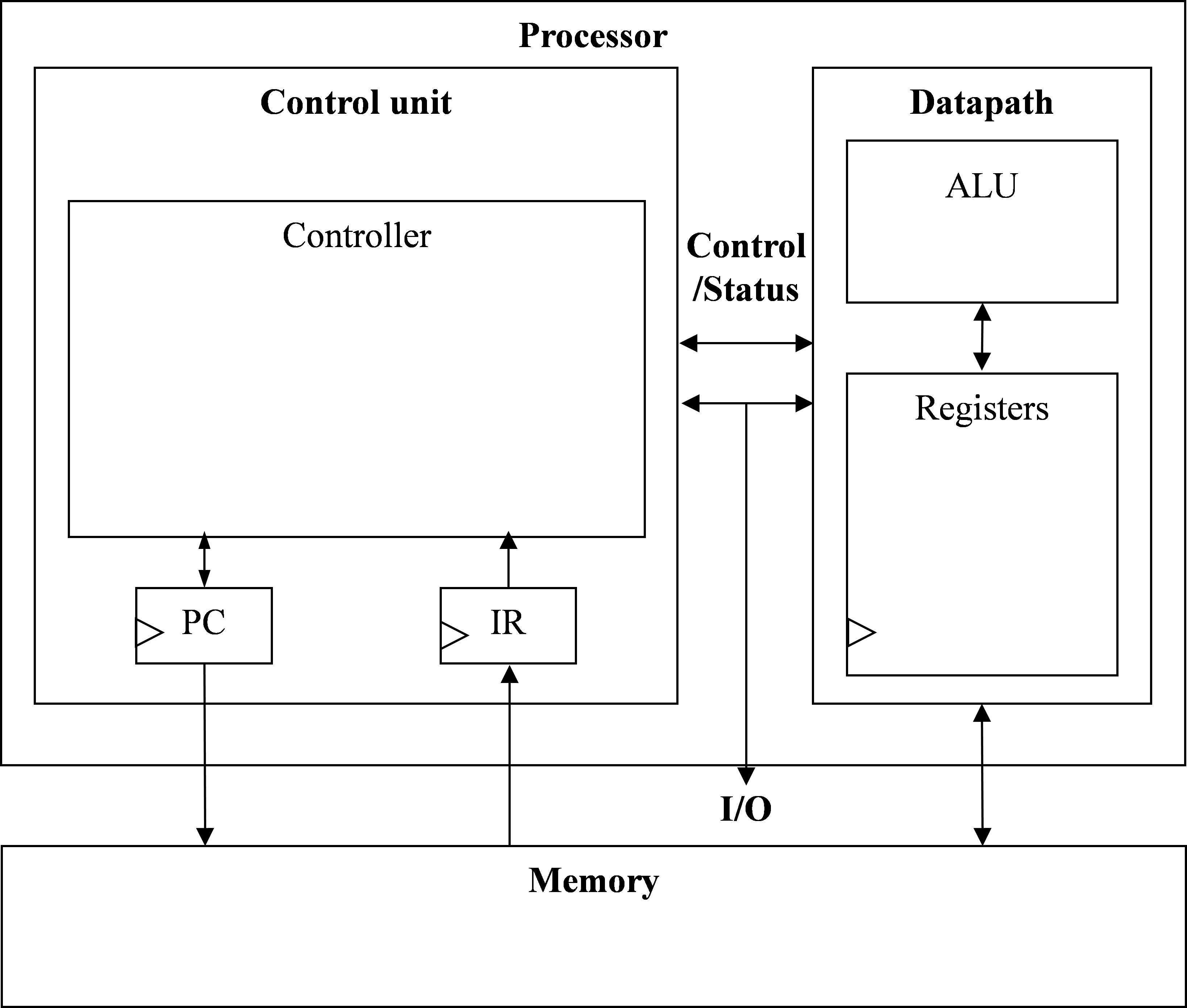 Bộ xử lý được cấu thành từ hai thành phần chính là đơn vị xử lý dữ liệu (datapath) và đơn vị điều khiển (control unit). Bộ vi xử lý thực hiện một chức năng mong muốn bằng cách nạp (fetch) và thực thi (execute) các lệnh (instruction) lưu sẵn trong bộ nhớ vì thế trong mô hình ứng dụng các vi xử lý thường gắn liền với một khối bộ nhớ để lưu chương trình và dữ liệu như chỉ ra trong Hình 1.