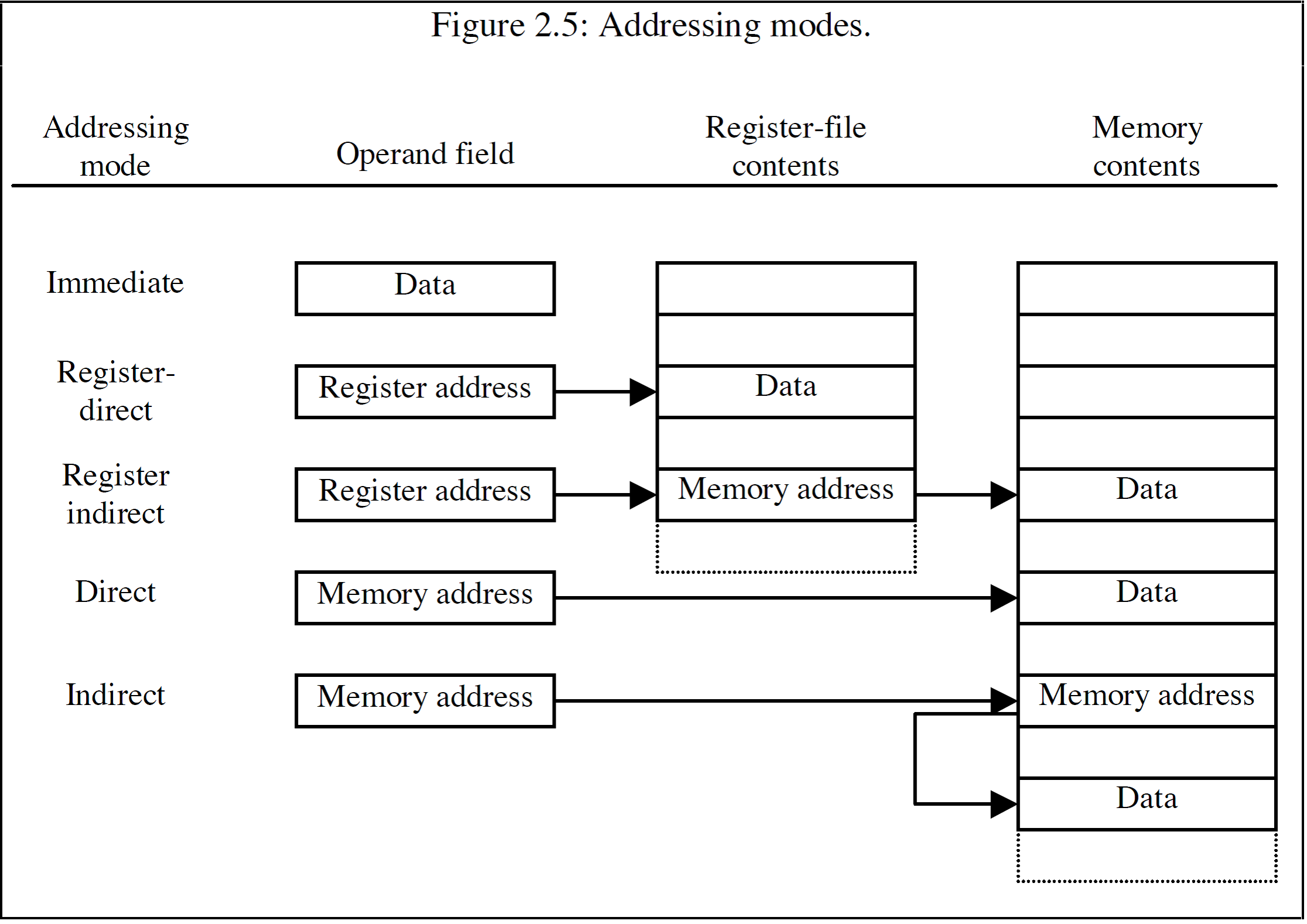 Trường toán hạng có thể chỉ ra vị trí của dữ liệu thông qua một trong số các chế độ địa chỉ như được minh họa trong Hình 2. Trong chế độ định địa chỉ tức thì (Immediate), trường toán hạng chứa bản thân dữ liệu cần truy xuất. Trong chế độ định địa chỉ trực tiếp thanh ghi (Register-direct), trường toán hạng chứa địa chỉ của thanh ghi trong datapath mà dữ liệu được lưu trong đó. Trong chế độ định địa chỉ gián tiếp thanh ghi (Register-Indirect), trường toán hạng chứa địa chỉ của thanh ghi mà nội dung của nó chứa địa chỉ của một vị trí bộ nhớ chứa dữ liệu. Trong chế độ định địa chỉ trực tiếp (Direct), trường toán hạng chứa địa chỉ của một vị trí bộ nhớ chứa dữ liệu thực sự cần truy xuất. Trong chế độ định địa chỉ gián tiếp (Indirect), trường toán hạng chứa địa chỉ của một vị trí bộ nhớ mà nội dung chứa địa chỉ của một vị trí bộ nhớ thực sự chứa dữ liệu. Trong ngữ cảnh của các ngôn ngữ lập trình cấu trúc thì các chế độ định địa chỉ trực tiếp thực hiện các biến thông thường và các chế độ định địa chỉ gián tiếp thực hiện các con trỏ. Ngoài ra còn một số chế độ định địa chỉ khác không được liệt kê trong Bảng 1 như chế độ định địa chỉ ẩn, chế độ định địa chỉ chỉ số, chế độ định địa chỉ tương đối. Trong chế độ định địa chỉ địa ẩn (implicit addressing), một thanh ghi hoặc vị trí bộ nhớ của dữ liệu được ẩn trong mã lệnh opcode, chẳng hạn dữ liệu có thể lưu trong thanh ghi tích lũy (accumulator). Trong chế độ định địa chỉ chỉ số (indexed addressing), toán hạng trực tiếp hoặc gián tiếp phải được cộng thêm vào một thanh ghi ngầm định cụ thể để có được địa chỉ toán hạng thực tế. Các lệnh nhảy có thể sử dụng chế độ định địa chỉ tương đối để giảm số lượng bit cần thiết để chỉ ra địa chỉ bước nhảy. Một địa chỉ tương đối cho biết khoảng cách nhảy từ địa chỉ hiện tại, thay vì chỉ ra địa chỉ đầy đủ – chế độ định địa chỉ này rất phổ biến vì hầu hết các bước nhảy là tới lệnh gần đó.