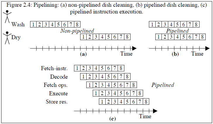 Liên hệ tới quá trình thực thi lệnh của bộ vi xử lý có thể thấy mỗi đĩa ăn giống như một lệnh và hai nhiệm vụ rửa và sấy khô đĩa giống như năm giai đoạn thực thi lệnh được liệt kê ở trên. Bằng cách sử dụng một đơn vị phần cứng riêng biệt (mỗi đơn vị tương tự như một người) cho mỗi giai đoạn, chúng ta có thể đường ống hóa quá trình thực hiện lệnh. Sau khi đơn vị nạp lệnh tìm nạp lệnh đầu tiên, đơn vị giải mã sẽ giải mã nó trong khi đơn vị tìm nạp lệnh đồng thời tìm nạp lệnh tiếp theo. Ý tưởng về kỹ thuật đường ống hóa được minh họa trong Hình 3. Lưu ý rằng để đường ống hoạt động tốt, việc thực hiện lệnh phải được phân tách thành các giai đoạn có độ dài gần bằng nhau và mỗi lệnh phải yêu cầu cùng một số chu kỳ.