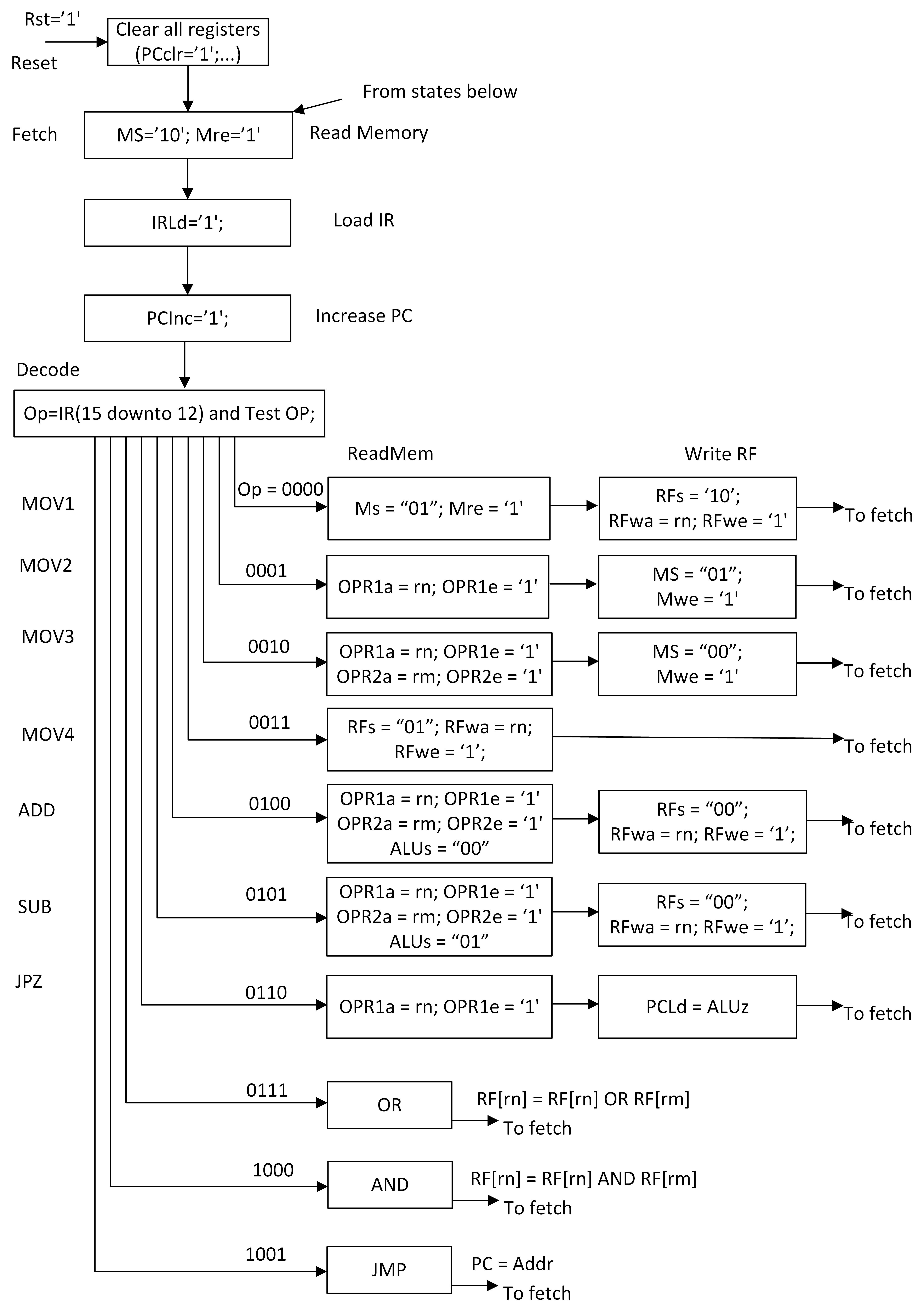 Chúng ta áp dụng «quy trình các bước thiết kế mạch tích hợp» để đưa ra kiến trúc mức RTL của bộ vi xử lý. Vì bộ vi xử lý không thực hiện bất kỳ một thuật toán nào cụ thể mà chỉ thực thi một tập hợp các lệnh Instruction cho trước nên chúng ta sẽ bắt đầu quá trình thiết kế bằng việc trực tiếp đưa ra mô hình máy trạng thái phức hợp FSMD (FSM with Datapath) cho bộ vi xử lý. Từ mô hình FSMD chúng ta xây dựng cấu trúc đơn vị xử lý dữ liệu – datapath sau đó xây dựng máy trạng thái FSM bằng cách loại bỏ các phần tính toán đã được thực hiện bởi Datapath ra khỏi FSMD. Phần FSM chính là mô hình mô tả hoạt động của khối điều khiển (Controller) trong Hình 1. Sau khi có được mô hình máy trạng thái FSM và kiến trúc Datapath chúng ta có thể tiến hành mô tả chúng bằng VHDL để có thể thực hiện việc mô phỏng kiểm chứng hoạt động chức năng của bộ vi xử lý trên máy tính.