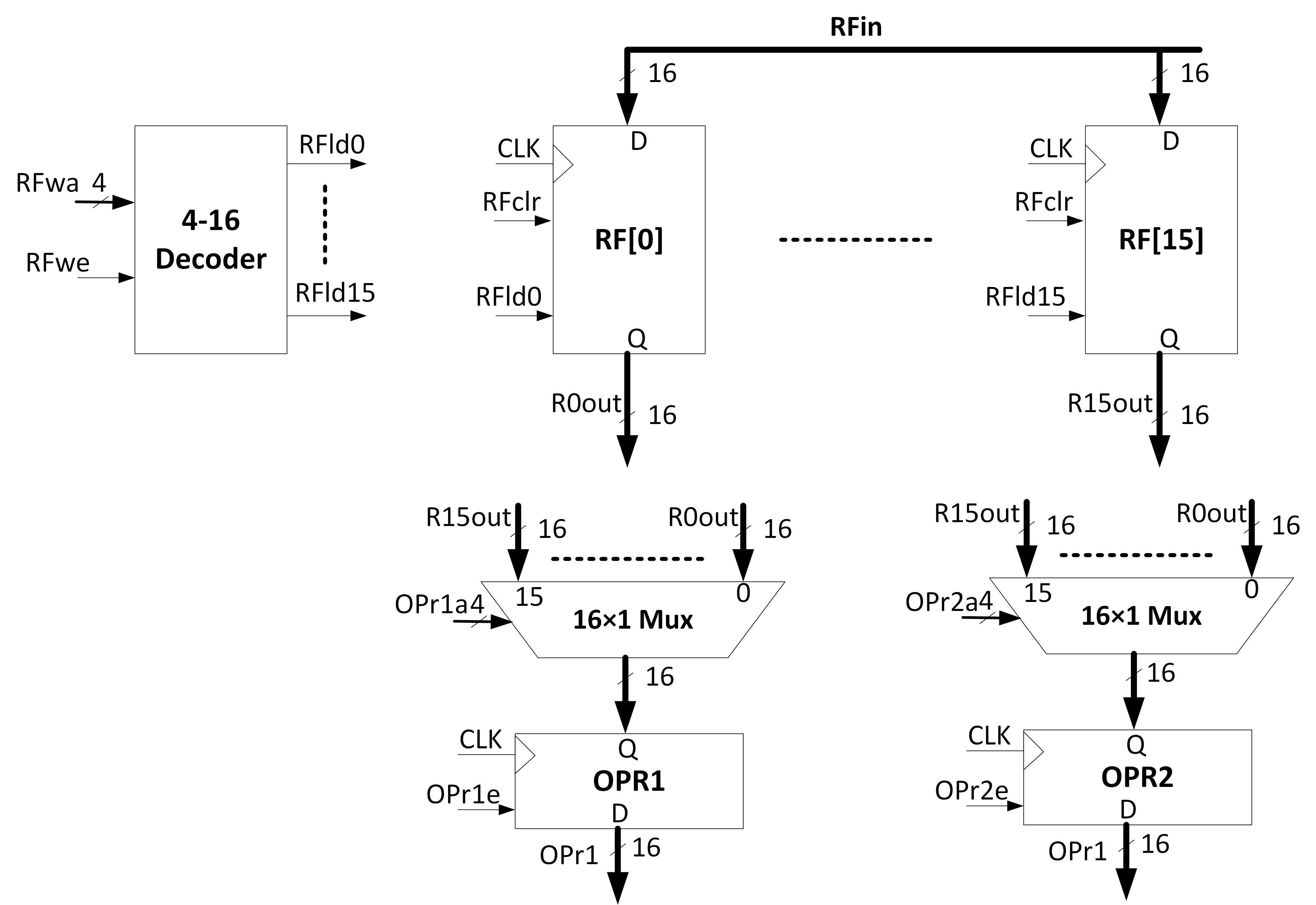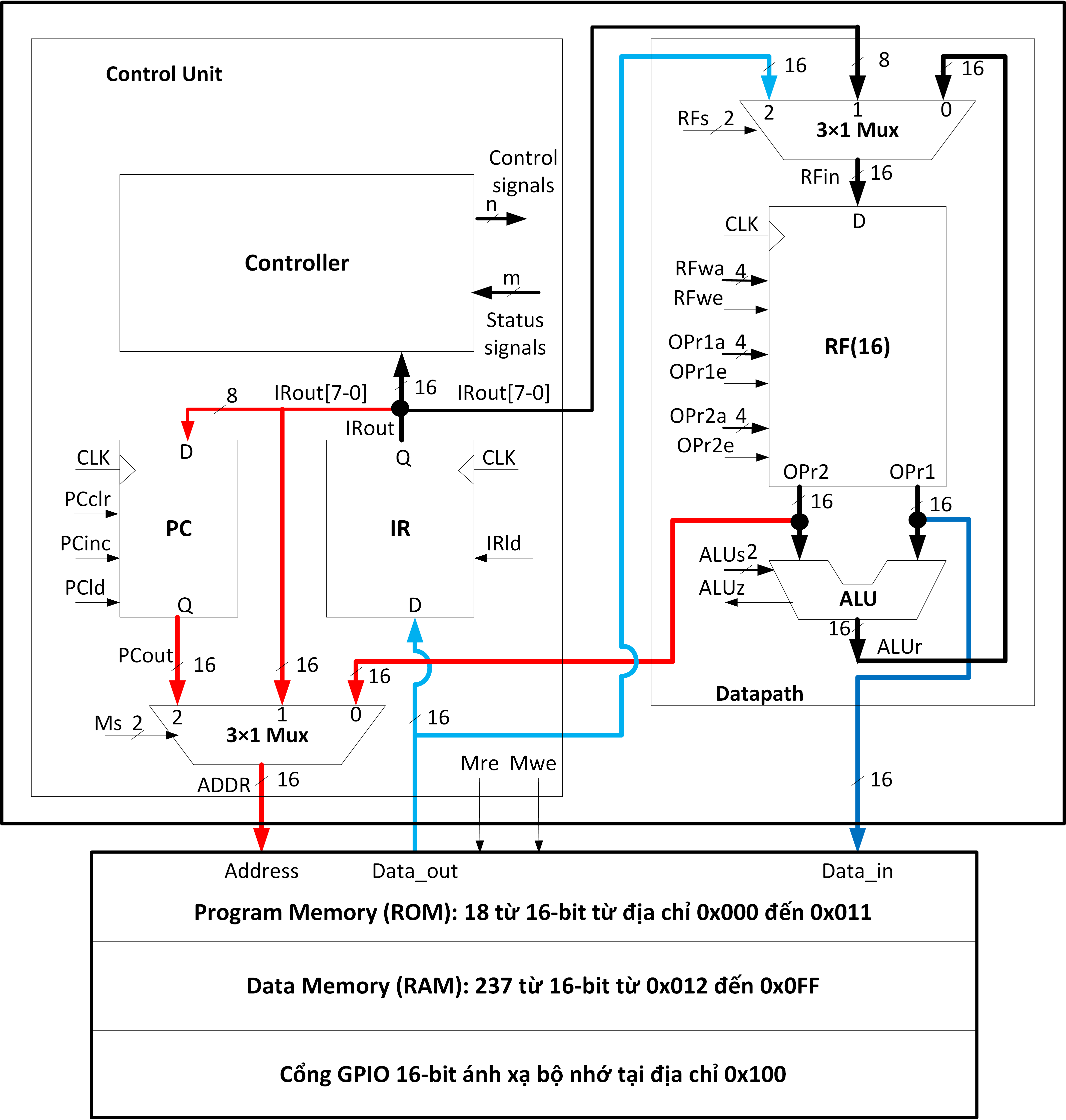 - Tệp thanh ghi RF (Register File): 16×16 bit, dùng lưu dữ liệu trong quá trình tính toán của ALU