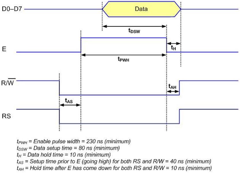 Lưu ý rằng thao tác viết xảy ra trên sườn chuyển tiếp 1-sang-0 của tín hiệu trên chân E. Bộ vi điều khiển phải tạo ra dữ liệu sẵn sàng và ổn định trên các đường dữ liệu trước khi tạo ra sườn chuyển tiếp 1-sang-0 của tín hiệu trên chân E để thỏa mãn yêu cầu về thời gian thiết lập như chỉ ra trong Hình 4‑1.