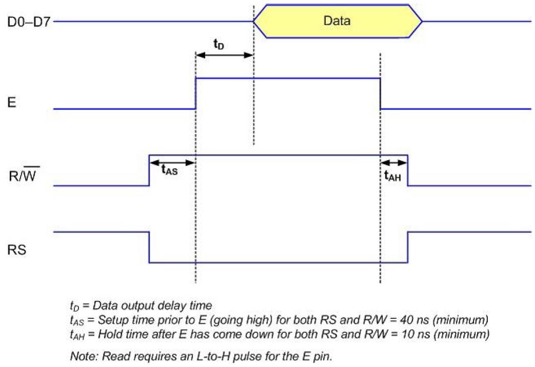 Hoạt động đọc được kích hoạt bởi xung 0-sang-1 của tín hiệu trên chân E. Sau thời gian trễ, bộ điều khiển LCD sẽ phải tạo ra dữ liệu sẵn sàng trên bus dữ liệu nếu đường tín hiệu R/W ở mức cao. Bộ vi điều khiển nên đọc dữ liệu từ các bus dữ liệu trước khi hạ tín hiệu trên chân E xuống mức thấp.