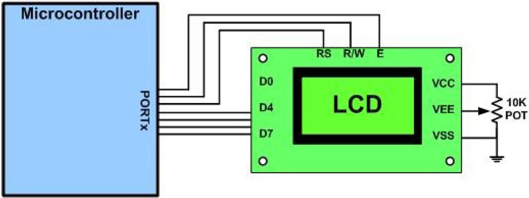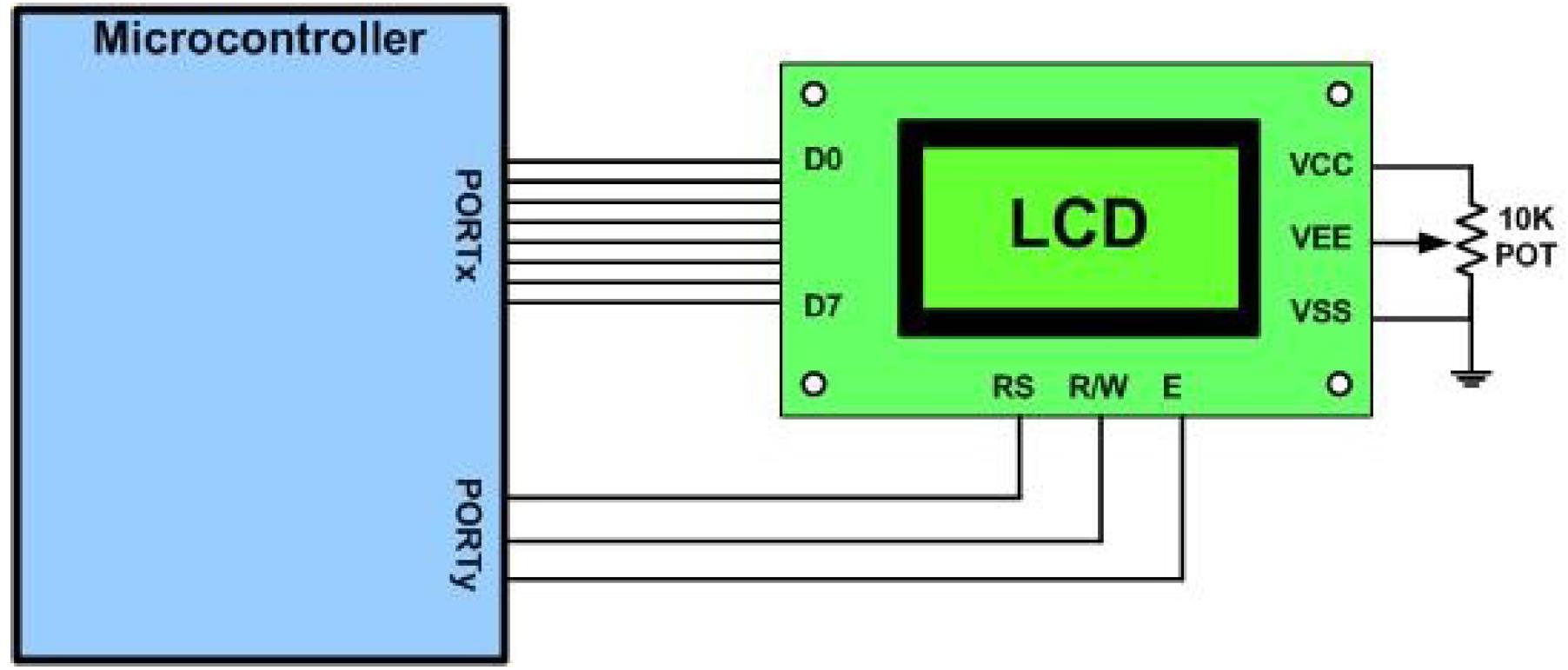 - Nguồn VCC, VSS và VEE: trong khi VCC và VSS cung cấp nguồn nuôi +5V và đất tương ứng thì VEE được sử dụng để điều khiển độ tương phản LCD.