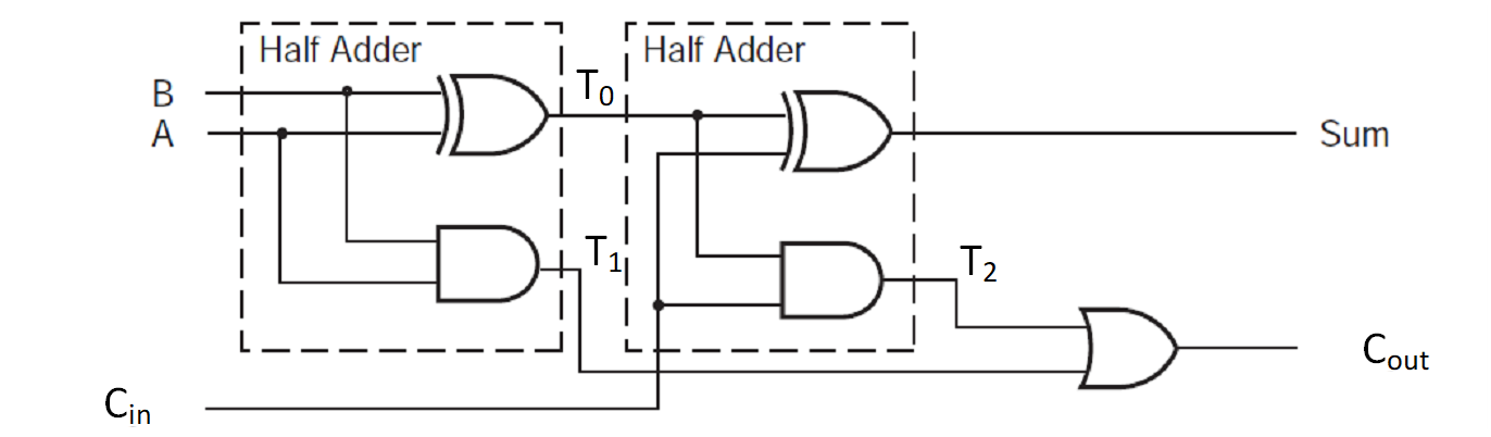 Đầu tiên thiết kế bộ cộng Half-adder sau đó dùng hai bộ cộng half-adder để xây dựng bộ cộng full-adder như cấu trúc chỉ ra trong Hình 1‑2.