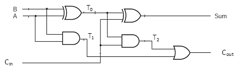 USE ieee.std_logic_1164.all; ENTITY fulladder_dfl IS PORT ( a,b : IN std_logic; cin : IN std_logic; sum : OUT std_logic; cout : OUT std_logic); END fulladder_dfl; ARCHITECTURE architecture_fulladder_dfl OF fulladder_dfl IS Signal T0, T1, T2 : STD_LOGIC; BEGIN –Statements are here T0 <= A XOR B; T1 <= A AND B; SUM <= Cin XOR T0; T2 <= Cin AND T0; Cout <= T1 OR T2; END architecture_fulladder_dfl; |