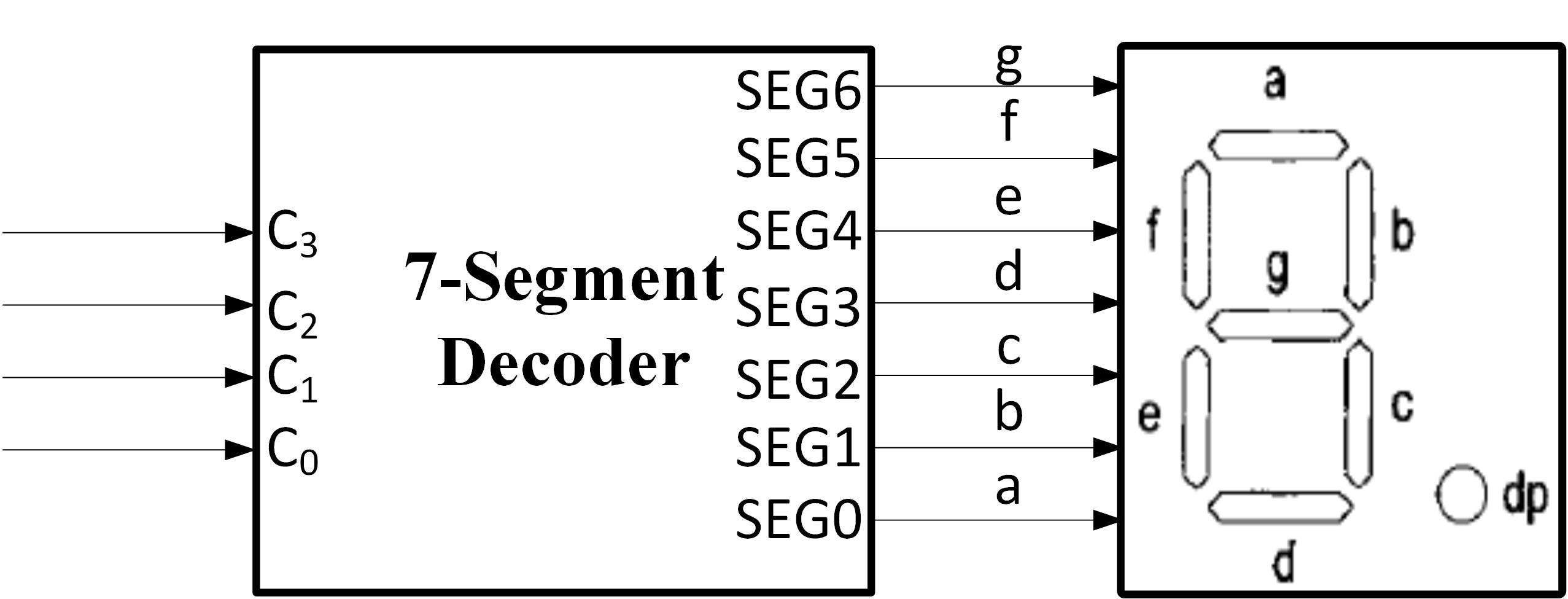 Bộ giải nhị phân sang mã 7 đoạn nhận đầu vào là 4 bit nhị phân dưới dạng chữ số thập lục phân và tạo ra các mẫu LED thích hợp như chỉ trong Hình 2‑1(b). Các tín hiệu điều khiển LED, a, b, c, d, e, f, g được nhóm lại với nhau dưới dạng tín hiệu 7 bit ký hiệu là SE(0 to 6).