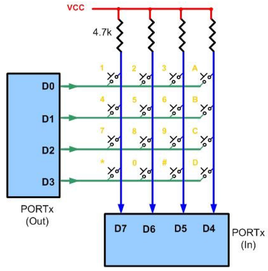 Hình 3‑20 cho thấy một bàn phím dạng ma trận 4×4 được kết nối với hai cổng của vi điều khiển. Các hàng được kết nối với một cổng đầu ra và các cột được kết nối với một cổng đầu vào. Tất cả các chân đầu vào đều được kết nối với điện trở kéo lên nguồn VCC. Như vậy, nếu không có phím nào được nhấn, đọc cổng đầu vào sẽ trả lại giá trị 1 trên tất cả các cột. Nếu tất cả các hàng được điều khiển ở mức thấp và một phím được nhấn, cột chứa phím đó sẽ đọc được giá trị 0 do phím được nhấn đã ngắn mạch cột đó với hàng được điều khiển ở mức thấp. Chức năng của bộ vi xử lý là quét liên tục bàn phím để phát hiện và xác định phím được nhấn. Phần sau sẽ giải thích chi tiết chức năng này được thực hiện thế nào.