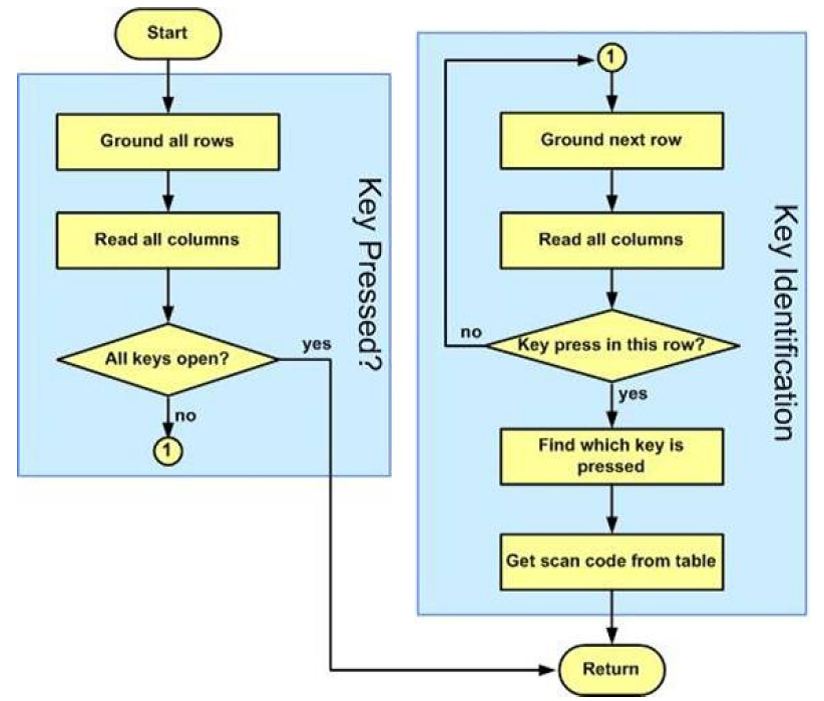 Để phát hiện phím được nhấn hay không, bộ vi điều khiển xuất mức logic thấp tới tất cả các hàng sau đó đọc các cột. Nếu dữ liệu được đọc từ các cột là D7÷D4 = 1111 có nghĩa là không có phím nào được nhấn và quá trình quét tiếp tục cho đến khi phát hiện có nhấn phím. Tuy nhiên, nếu một trong các bit cột có giá trị 0 thì điều này có nghĩa là có phím được nhấn. Ví dụ, nếu D7÷D4 = 1101, điều này có nghĩa là một phím trong cột D5 đã được nhấn.