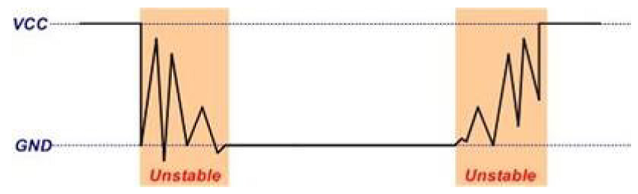 Khi một phím bấm cơ học được đóng hoặc mở, các tiếp điểm sẽ không tạo ra tiếp xúc hoặc ngắt tiếp xúc ngay lập tức, thay vào đó các tiếp điểm sẽ mở và đóng nhiều lần trước khi chúng ổn định. Hiện tượng này được gọi là sự nảy cơ học của các tiếp xúc trong phím bấm (xem Hình 3‑22). Vì vậy, có thể xảy ra tình huống khi chương trình lần đầu tiên phát hiện một phím bấm được nhấn nhưng khi xác nhận lại xem có đúng có phím được nhấn hay không nó lại nhận được trạng thái phím không được nhấn. Một vấn đề khác được gây ra bởi sự nảy của tiếp xúc cơ học là cùng một lần nhấn phím có thể được chương trình nhận dạng thành nhiều lần nhấn phím. Sự nảy của tiếp xúc cơ học cũng xảy ra khi phím bấm được nhả. Vì các điểm tiếp xúc của phím bấm chuyển trạng thái mở và đóng nhiều lần trước khi chúng ổn định, chương trình có thể nhận biết phím khi phím được nhả như một trạng thái nhấn.