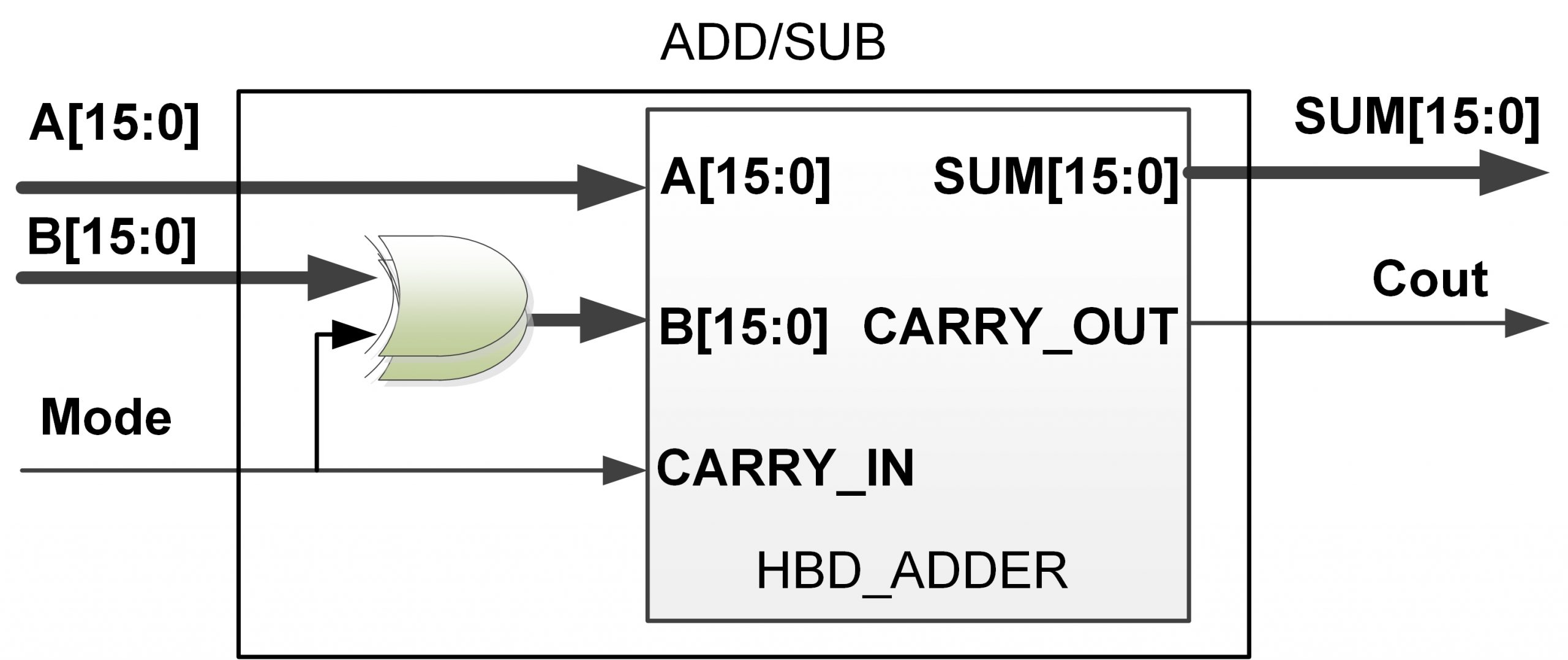 Tín hiệu Mode được dùng để chọn chế độ hoạt động của bộ ADD/SUB là cộng (Mode = 0) hay trừ (Mode = 1).