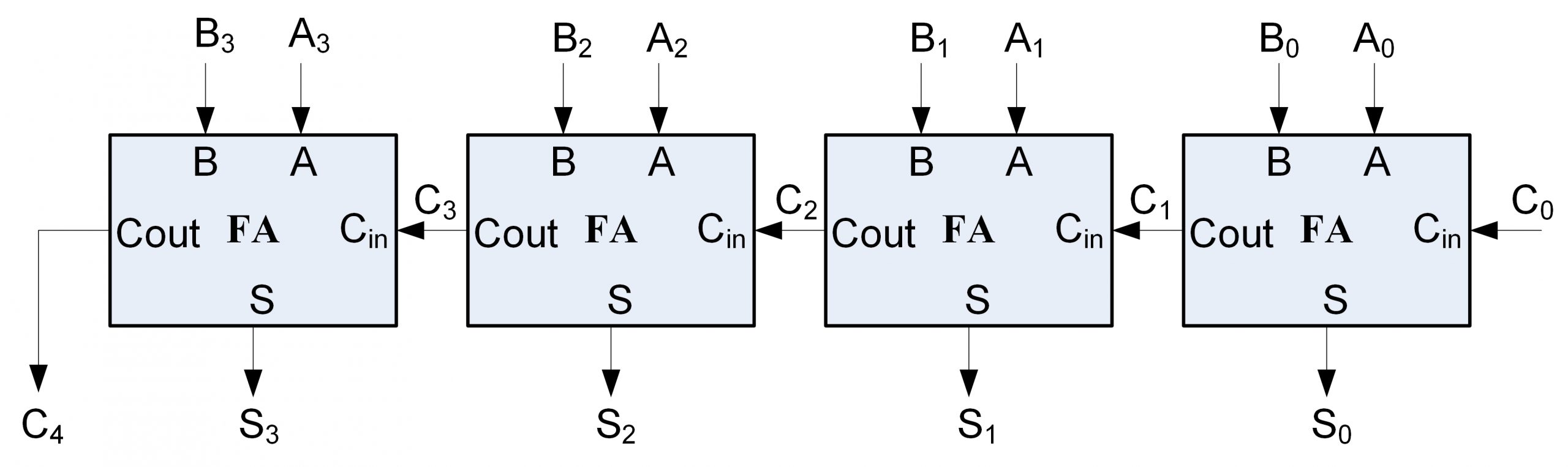 - Nhược điểm: Trễ lan truyền cờ nhớ lớn, dẫn đến tốc độ tính toán chậm. Gọi τ là trễ lan tuyền qua mỗi cổng logic (trong hình Hình 37), thì trễ lan truyền cờ nhớ trong thực hiện bộ cộng RCA n-bit sẽ là (2n+1)τ. Rõ ràng cho giá trị n càng lớn thì trễ này sẽ càng lớn, dẫn đến tốc độ tính toán của bộ cộng rất chậm.