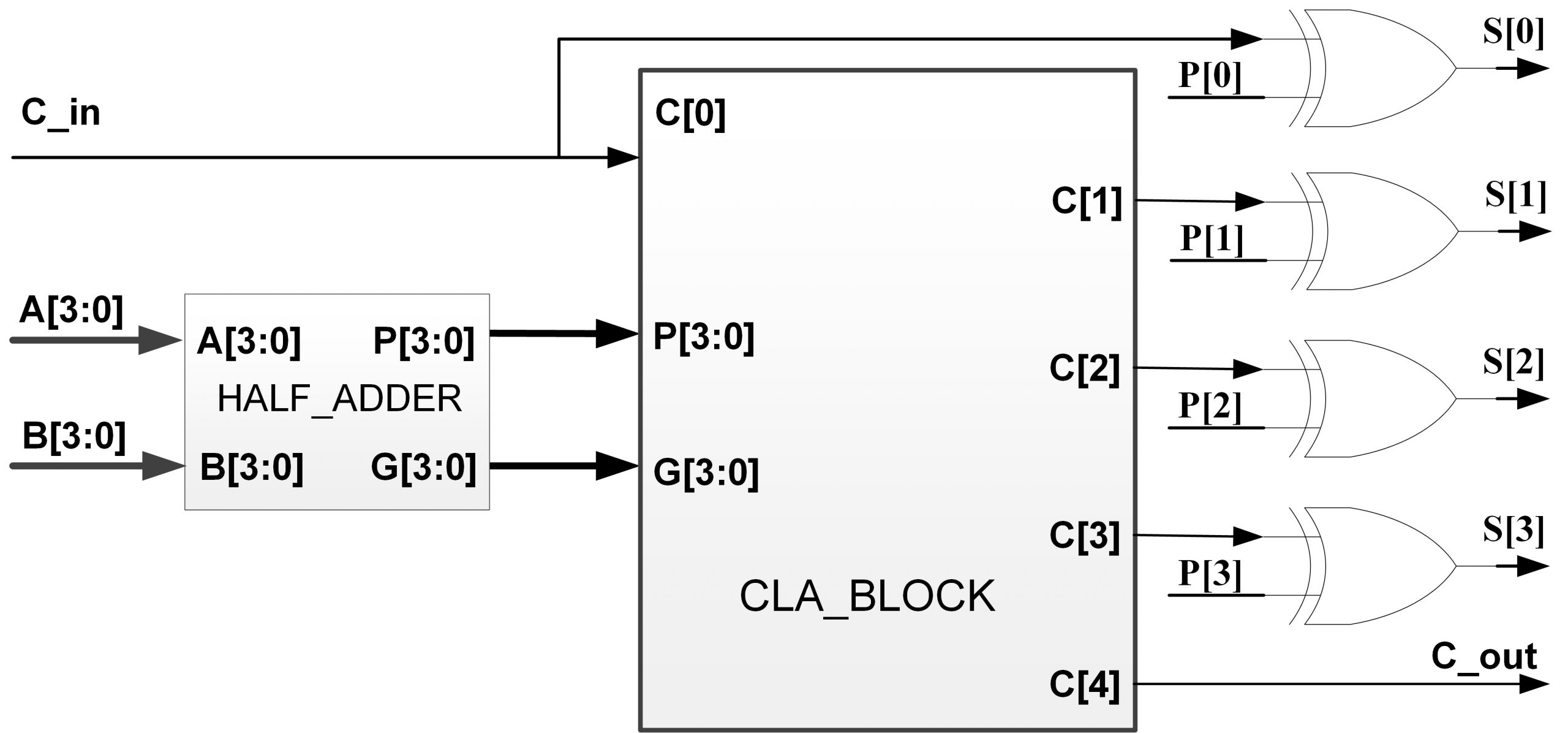 Do đó bài viết này chọn phương pháp thực hiện lai ghép giữa bộ cộng CLA và phương pháp chọn cờ nhớ CSA. Các số hạng lối vào A, B được tách thành các nible 4-bit và thực hiện tính tổng song song bởi 4 module bộ cộng CLA 4-bit. Kết quả tổng của A và B sẽ được lựa chọn bằng phương pháp chọn cờ nhớ. Sơ đồ khối bộ cộng 16 bit lai ghép được chỉ ra trong Hình 39. Mỗi khối CLA_ADDER là một bộ cộng hai số 4-bit theo phương pháp CLA có cấu trúc như được chỉ ra trong Hình 38.