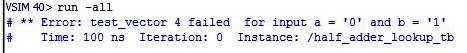 Testbench này giống như testbench trước cho đến Dòng 15, sau đó câu lệnh process được sử dụng để định nghĩa các mẫu đầu vào như có thể thấy ở các dòng 20-21 (“00”), 27-28 (“01”), 33-34 (“10”) và 39-40 (“11”). Hơn nữa, đầu ra dự kiến cũng được hiển thị bên dưới các dòng này, ví dụ dòng 23 cho thấy tổng sum là ‘0’ và cờ nhớ carry là ‘0’ ứng với đầu vào “00”. Hơn thế, nếu đầu ra được tạo bởi half adder khác với các giá trị dự kiến này thì testbench sẽ tạo ra một thông báo lỗi. Chẳng hạn, khi chạy mô phỏng một thông báo lỗi sẽ được tạo ra bởi dòng 50 cho mẫu đầu vào “01” (Hình 1‑3) (vì tổng được tạo bởi Half_adder cho a = ‘0’ và b = ‘1’ (xác định trong dòng 46-47) là 1, trong khi tổng dự kiến cho tổ hợp này là 0 (được xác định ở dòng 49)). Lưu ý rằng, thông báo lỗi này được tạo ra nhằm mục đích minh họa cho hoạt động tự kiểm tra của testbench; lỗi này do giá trị mong đợi được nhập không chính xác chứ không phải do bộ cộng được thiết kế không chính xác (đầu ra của bộ cộng là chính xác). Lỗi sẽ được hiển thị trên cửa sổ “transcript” của ModelSim như chỉ ra trong Hình 1‑3.