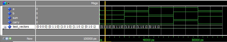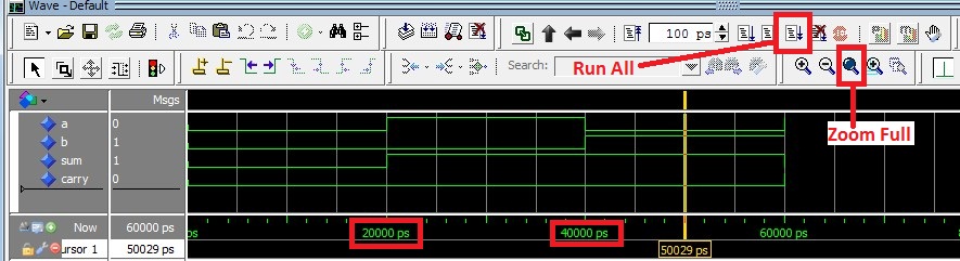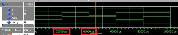 Trong Dòng 22, giá trị của a được khởi tạo là ‘0’ (ở 0 ns), sau đó nó thay đổi thành ‘1’ ở 20 ns và một lần nữa thay đổi thành ‘0’ ở 40 ns và ‘1’ ở 60 ns. Theo cách tương tự, giá trị của b ban đầu được khởi tạo là ‘0’ và thay đổi thành ‘1’ tại 40 ns tại Dòng 23. Theo cách này, 4 tổ hợp có thể được tạo ra và gán cho hai đầu vào (ab) là “00”, “01”, “10” và “11” như trong Hình 1‑1. Trong hình này cũng cho thấy các kết quả đầu ra tức là tổng và cờ nhớ tương ứng.