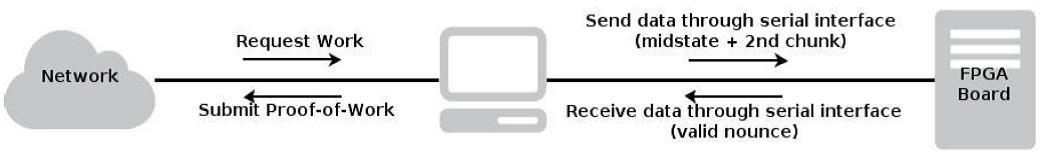 Để thực hiện giao tiếp giữa bo mạch FPGA và máy tính, chúng tôi đã phát triển cả ứng dụng Java và mô-đun VHDL sử dụng giao thức truyền thông nối tiếp RS-232 để gửi và nhận dữ liệu như được mô tả trong Hình 3. Chúng tôi đã chọn giao diện nối tiếp vì nó là một trong những giao thức truyền thông đơn giản nhất hiện có và tốc độ truyền thấp của nó không ảnh hưởng đến hiệu suất tổng thể của hệ thống. Giao tiếp nối tiếp bao gồm việc gửi 44 byte đến FPGA (32 byte cho đoạn giữa và 12 cho đoạn thứ hai) và nhận câu trả lời từ FPGA với 5 byte dữ liệu đã xử lý (4 byte cho đoạn nonce và 1 byte để chỉ ra tính hợp lệ). Ứng dụng Java cũng chịu trách nhiệm yêu cầu tiêu đề khối từ máy chủ và gửi bằng chứng công việc.